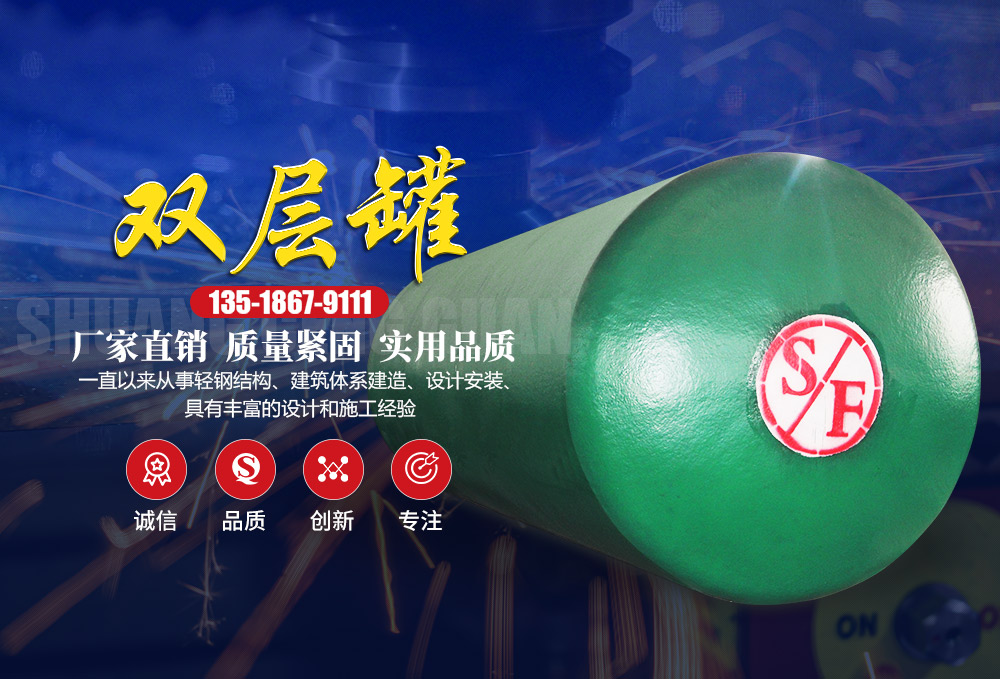 SF雙層油罐全名為鋼制強化玻璃纖維制雙層結構儲油容器,是在單層鋼制油罐外附加一層玻璃纖維增強塑料(即玻璃鋼)防滲外套,從而構成的雙層結構油罐。鋼制內罐與FRP外罐之間具有貫通間隙空間;同時配備滲漏檢測裝置,能對間隙空間進行24小時全監測到間隙空間底部液位時發出警報,保證油罐的安全使用